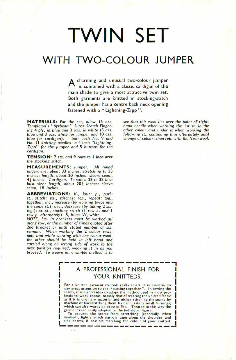 Ladies Two Colour Twin Set, Cardigan & Jumper, 33"-35" Bust, 4ply, 50s Knitting Pattern, Weldons 735